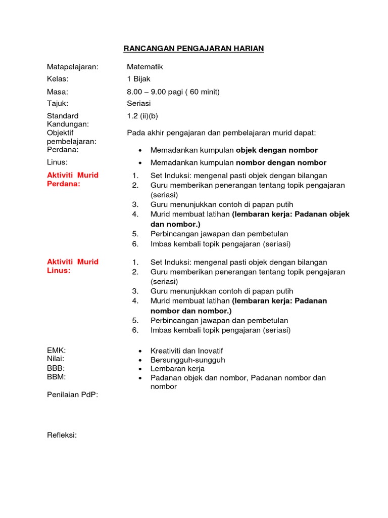 Rancangan Pengajaran Harian Matematik Tahun 1 Pdf Pdf